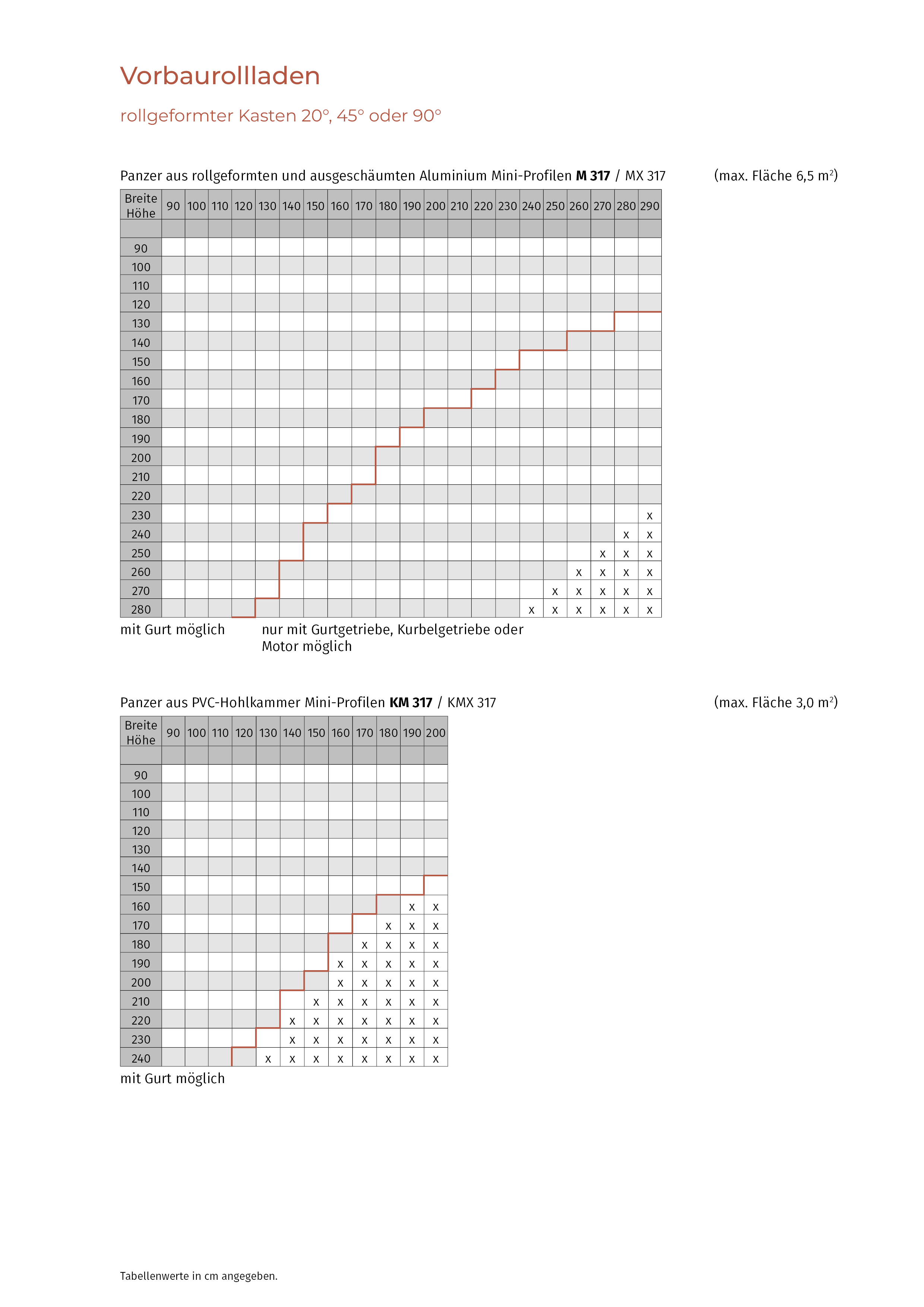 | Behang: | KM 317 PVC-Rollladenprofil mit Rillen, KMX 317 PVC-Rollladenprofil ohne Rillen, M 317 ausgeschäumtes Aluminiumprofil mit Rillen, MX 317 ausgeschäumtes Aluminiumprofil ohne Rillen |