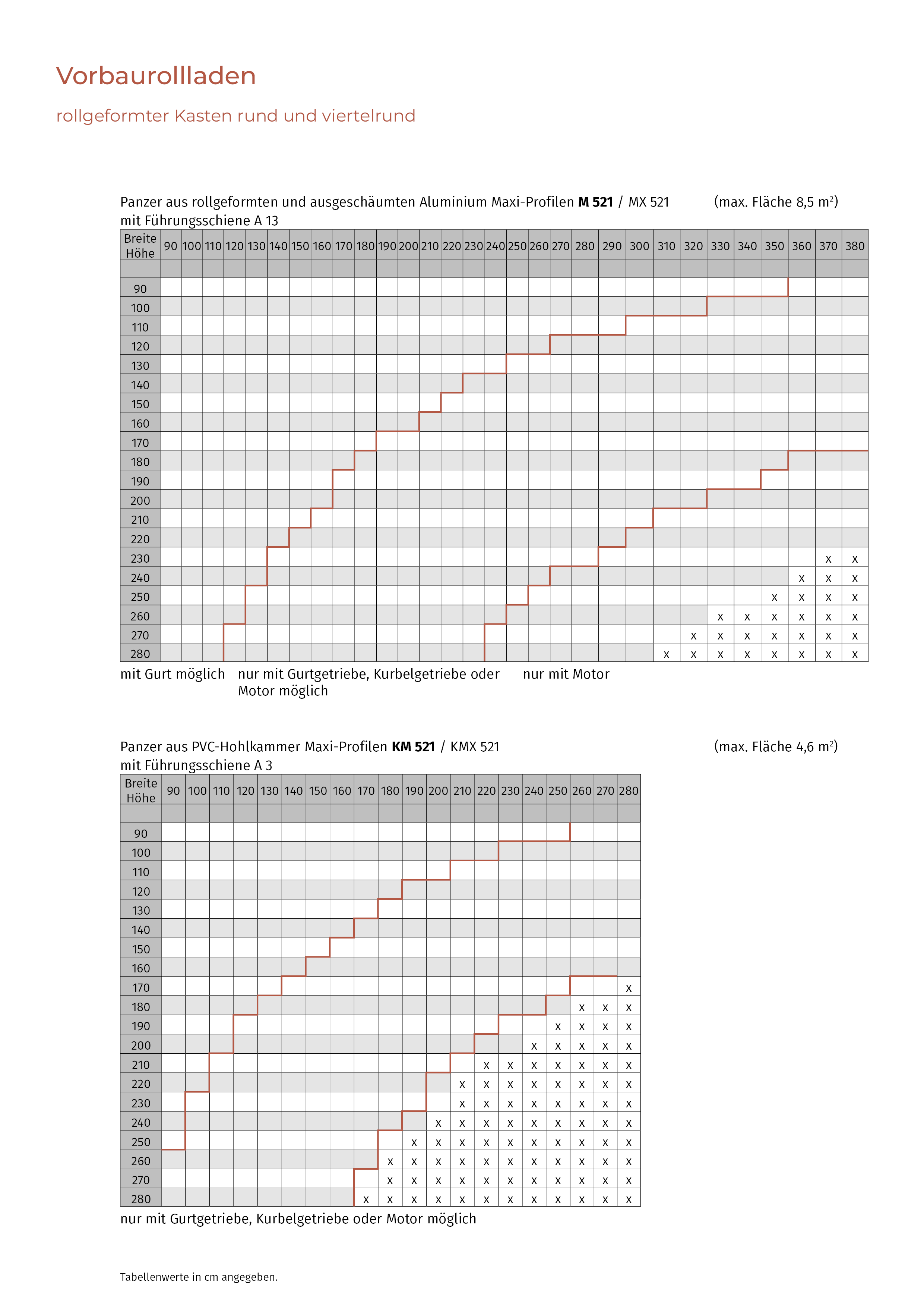 | Behang: | KM 521 PVC-Rollladenprofil mit Rillen, KMX 521 PVC-Rollladenprofil ohne Rillen, M 521 ausgeschäumtes Aluminiumprofil mit Rillen, MX 521 ausgeschäumtes Aluminiumprofil ohne Rillen |
