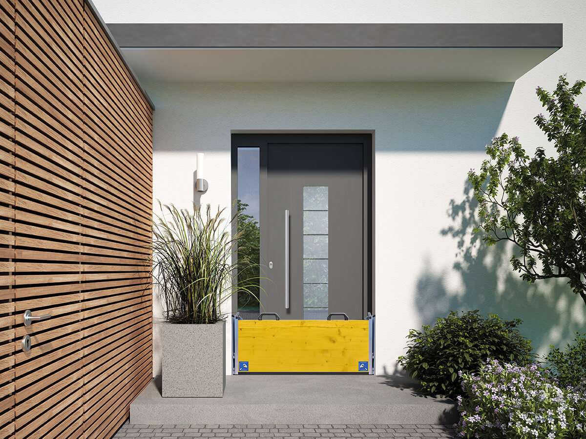 - Einsatzbereich: temporärer Hochwasserschutz vor Türen, Einfahrten, Fassadenabschnitten